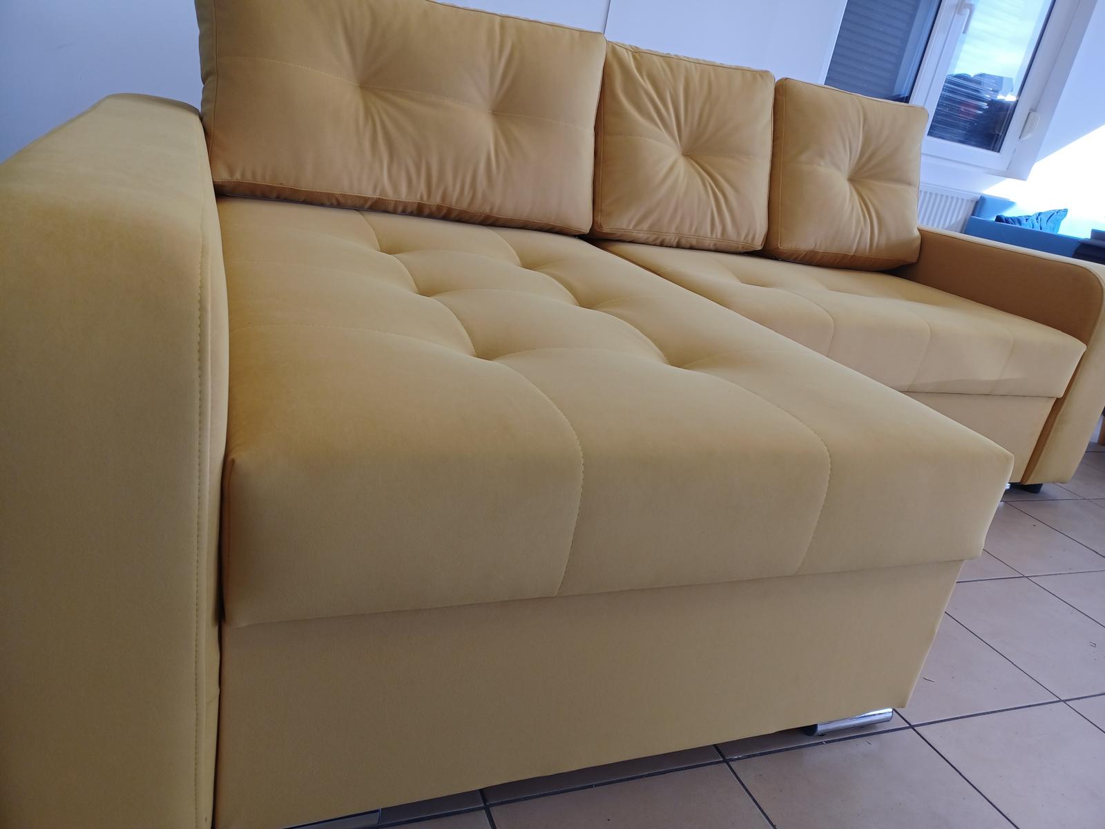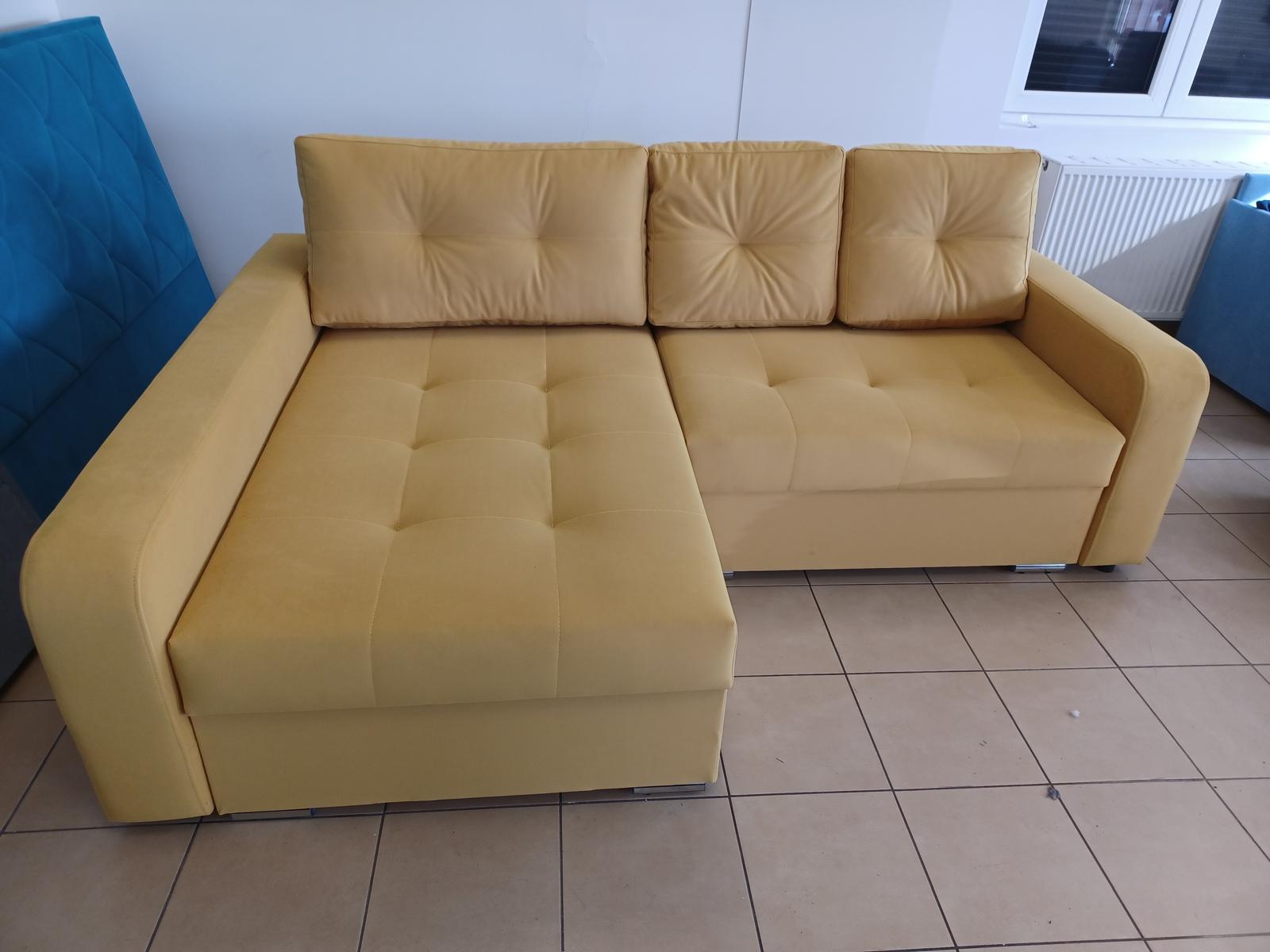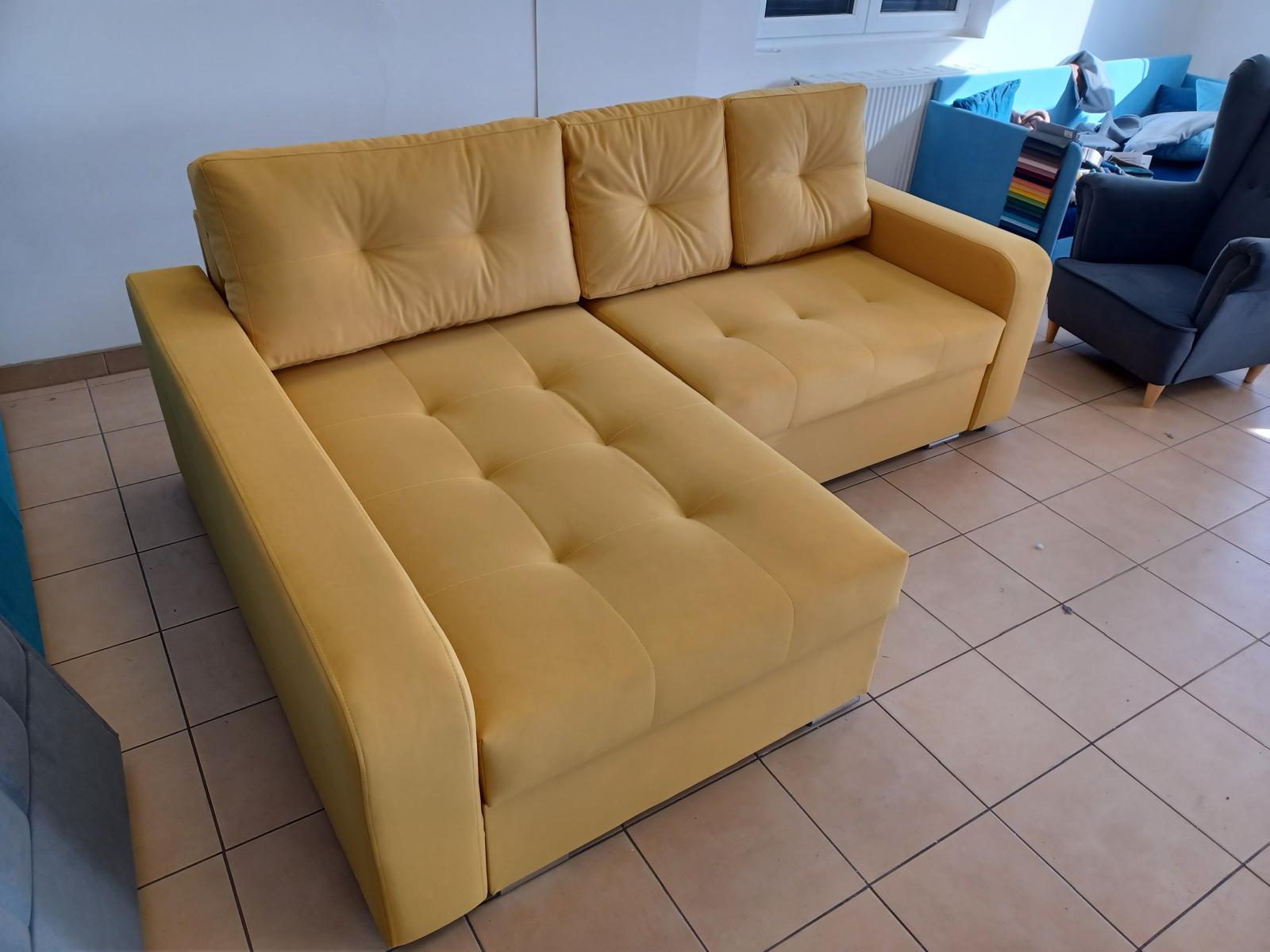 Nowoczesny narożnik Matera– styl i wygoda w Twoim wnętrzu. Wprowadź do swojego salonu elegancję i komfort dzięki naszemu nowoczesnemu narożnikowi. Ten wyjątkowy mebel został stworzony z myślą o miłośnikach eleganckiego designu i praktycznych rozwiązań oraz dużej powierzchni wypoczynkowej. Nasza propozycja wyróżnia się wygodnym siedziskiem, które zapewnia najwyższy komfort wypoczynku, oraz miękkimi poduszkami, idealnymi do relaksu po długim dniu. Mebel posiada funkcję spania oraz pojemnik, dzięki któremu zyskasz dodatkowe miejsce do przechowywania. Dzięki bogatej palecie tkanin i kolorów, możesz dopasować narożnik do swojego wnętrza i osobistego gustu. Wybierz spośród różnych odcieni i faktur, tworząc aranżację idealnie komponującą się z Twoim stylem. Wysokie nóżki dodają lekkości konstrukcji, a także ułatwiają utrzymanie porządku pod meblem. Wygląd narożnika po rozłożeniu zależny jest od modelu oraz wymiaru mebla. Cechy produktu:- sprężyna bonellowa