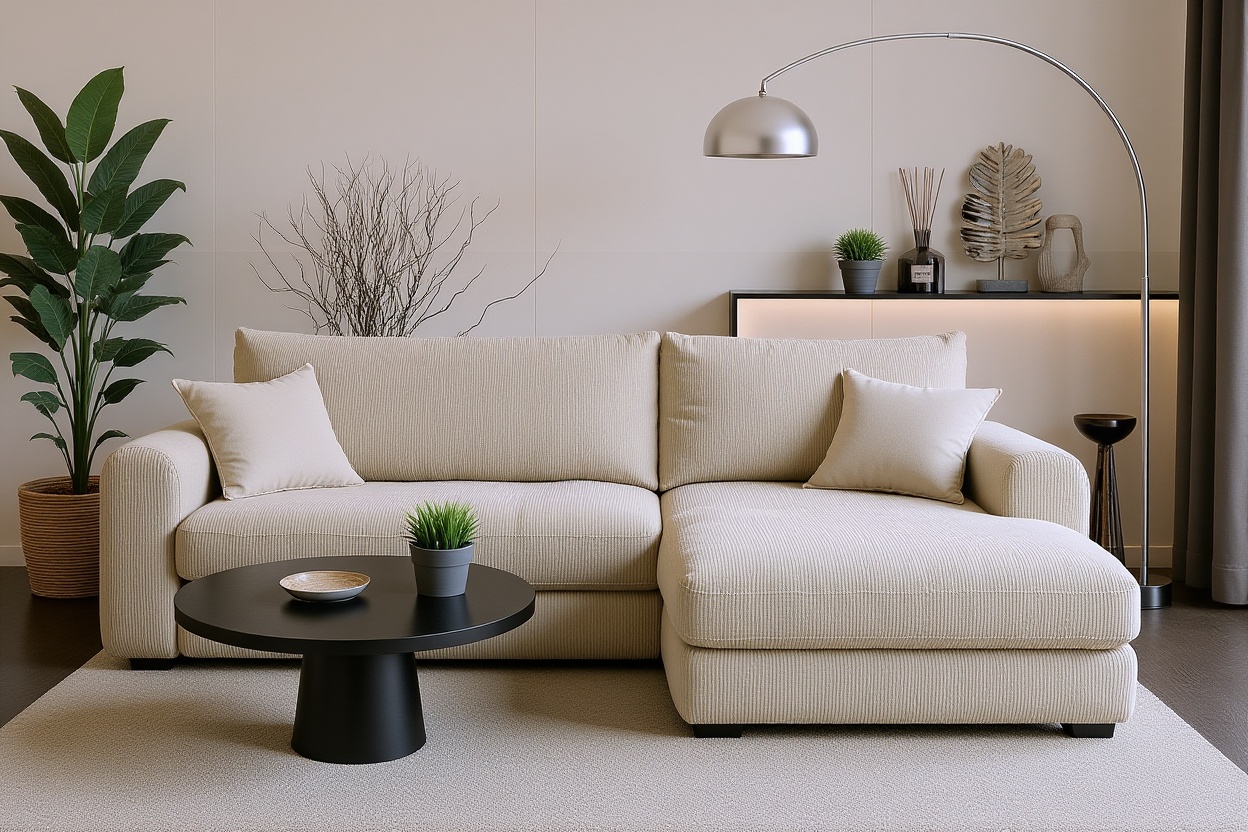 Funkcjonalność: Układ w kształcie litery L idealnie wpasowuje się w róg pomieszczenia, maksymalizując przestrzeń użytkową.