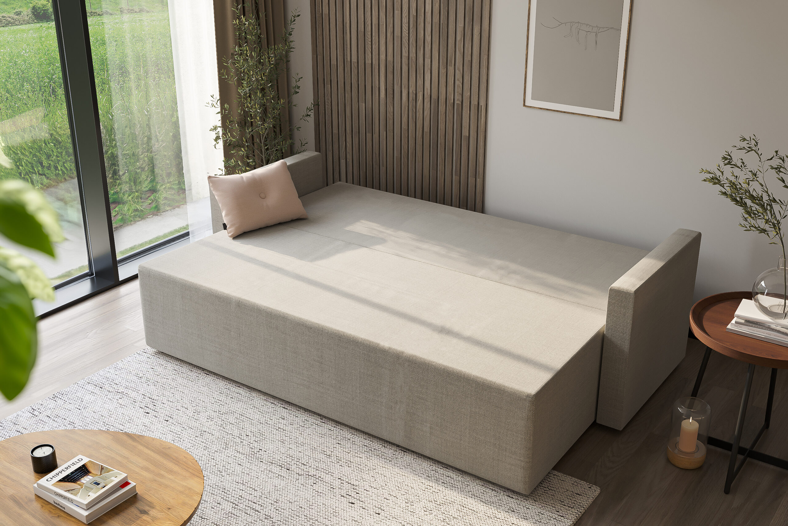 - Sofa posiada pojemnik, dzięki któremu zyskasz dodatkową przestrzeń do przechowywania oraz system rolkowy.