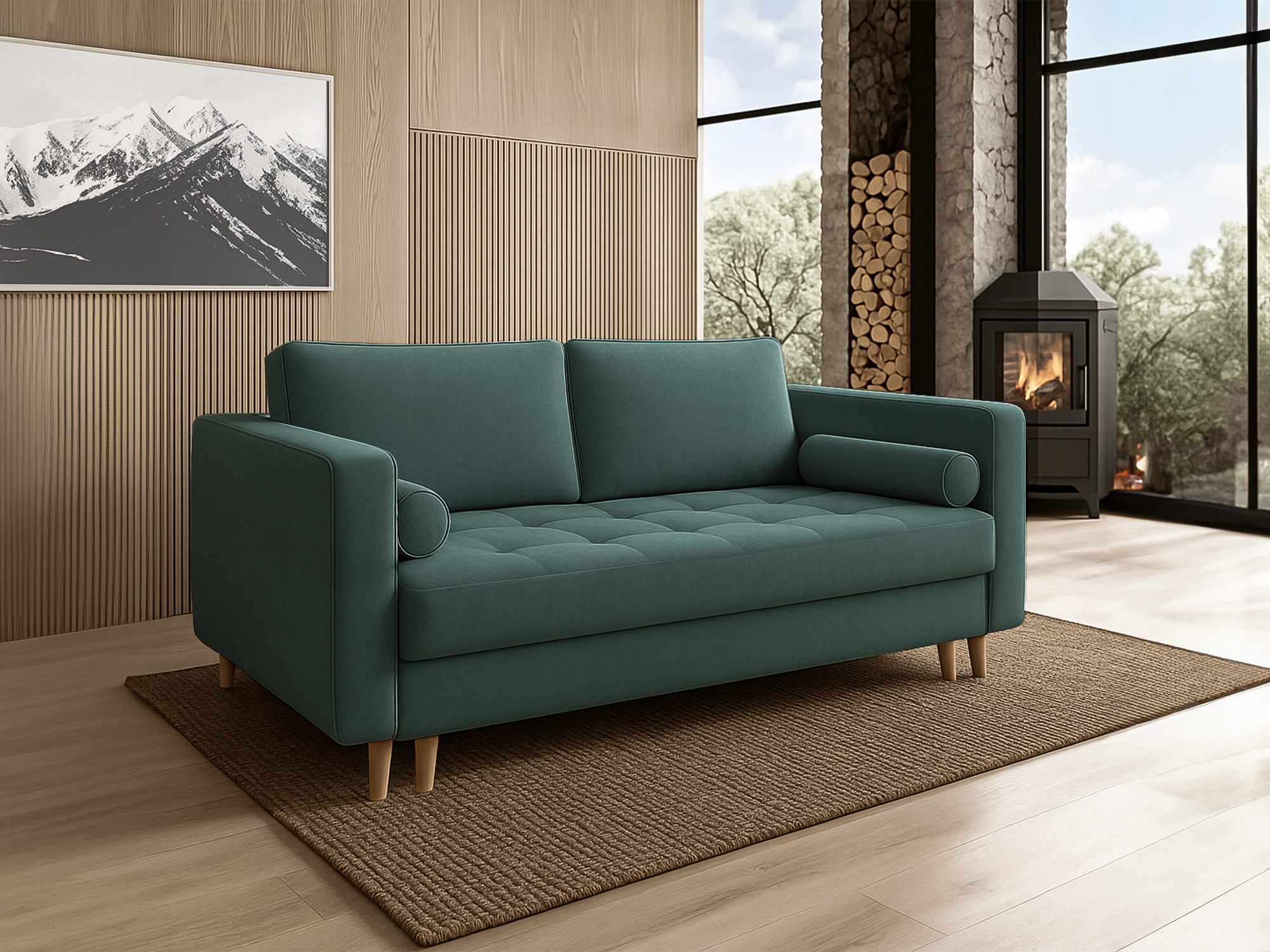 Sofa Lion to mebel wolnostojący, dzięki czemu idealnie sprawdzi się w centralnej części pomieszczenia. Wykonana została z wysokiej jakości materiałów z dbałością o każdy detal. W zestawie posiada dwie duże poduszki oraz dwa wałki.