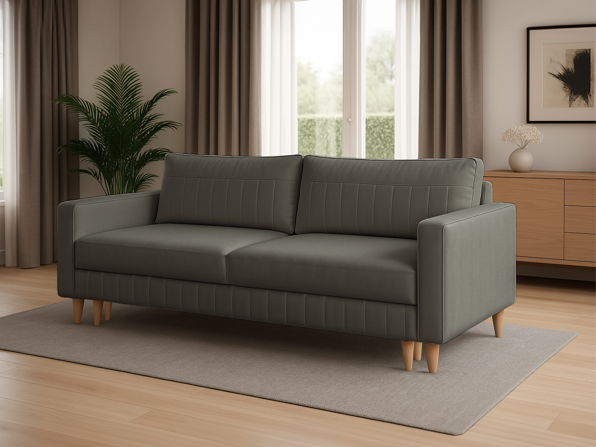 Sofa to jeden z najważniejszych elementów salonu, dlatego ważne jest aby spełniała wszystkie wymagania posiadacza. Wygodne siedzisko, wyprofilowane poduszki, staranne wykonanie to cechy, które posiadają nasze sofy. Dzięki bogatej palecie barw, każdy znajdzie coś dla siebie a różnorodność tkanin sprawi, że mebel wkomponuje się w każde wnętrze. Sofa Cassino to mebel wolnostojący, dzięki czemu idealnie sprawdzi się w centralnej części pomieszczenia. Wykonana została z wysokiej jakości materiałów z dbałością o każdy detal. Siedziko oraz poduszki posiadają delikatne przeszycia. Cechy produktu: - funkcja spania - jeden pojemnik na pościel - sprężyna bonellowa - pianka T-30 - mebel wolnostojący (tapicerowany tył) - automat DL (system ułatwiający rozkładanie) - drewniane nóżki2,600.00 zł
