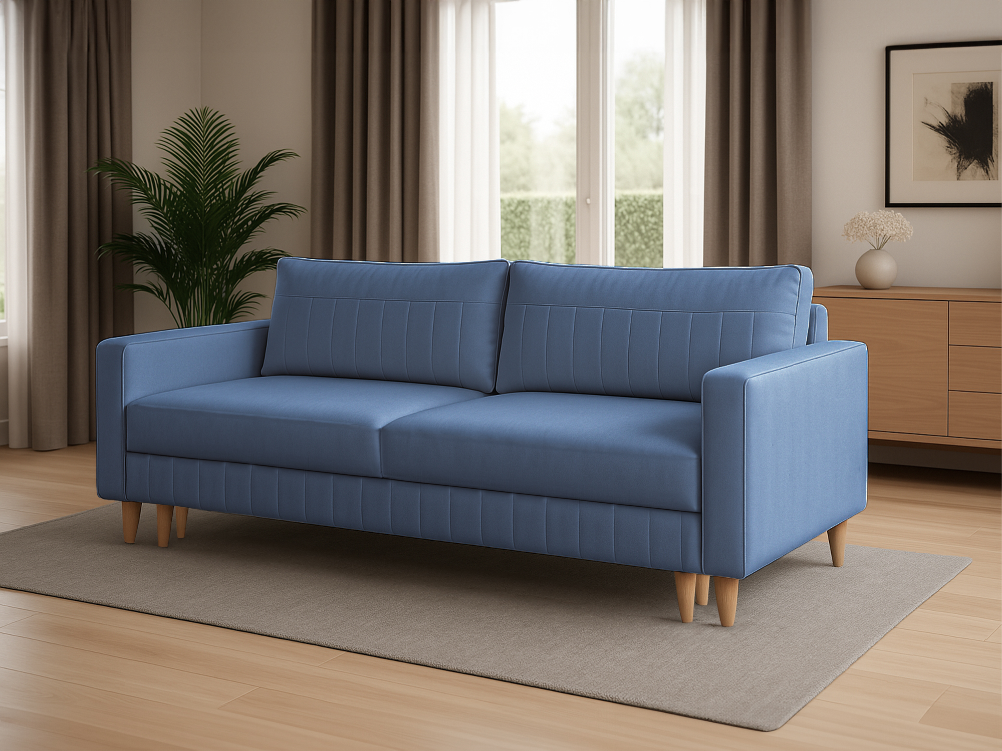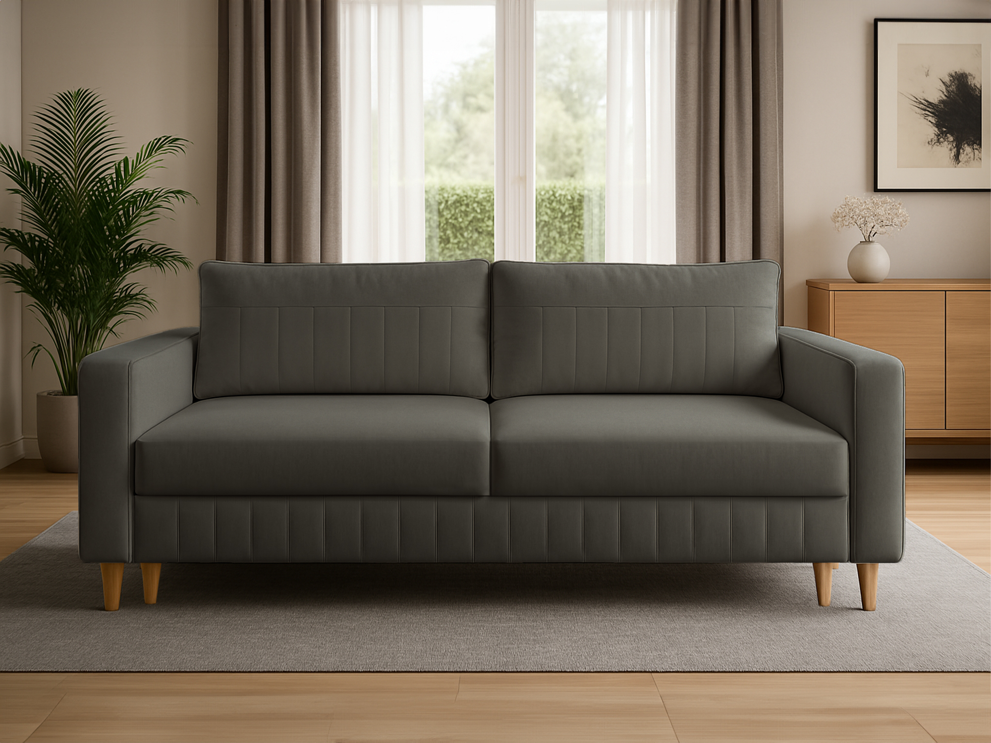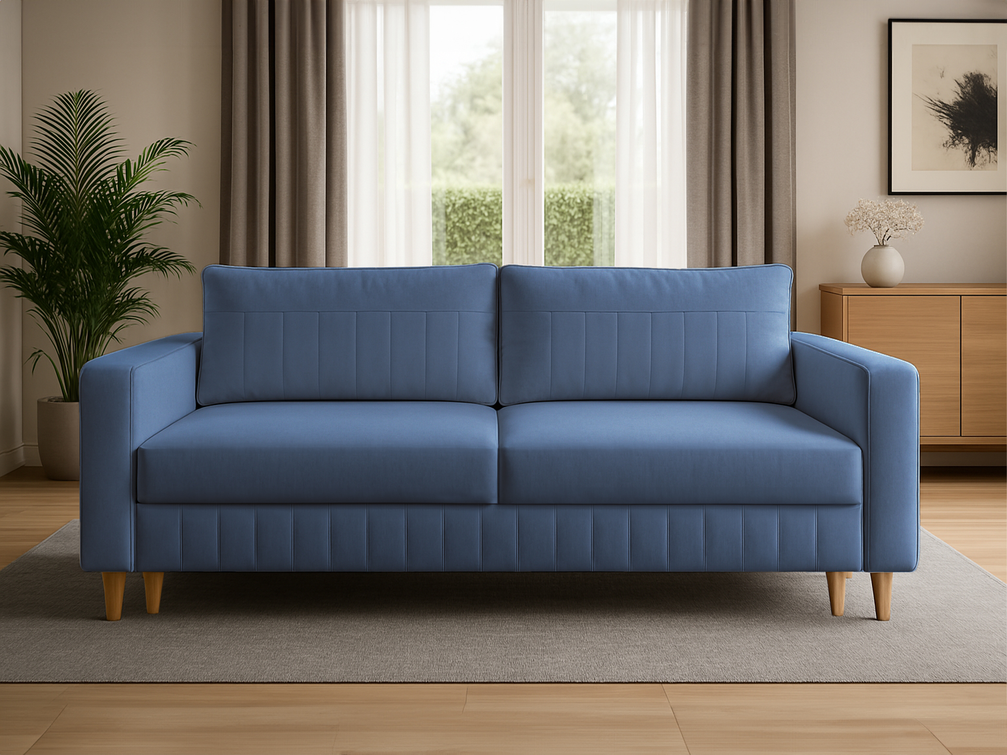 Sofa Livia to mebel wolnostojący, dzięki czemu idealnie sprawdzi się w centralnej części pomieszczenia. Wykonana została z wysokiej jakości materiałów z dbałością o każdy detal. Pionowe przeszycia widoczne na skrzyni, boczkach oraz poduszkach nadają bryle niespotykanego charakteru.