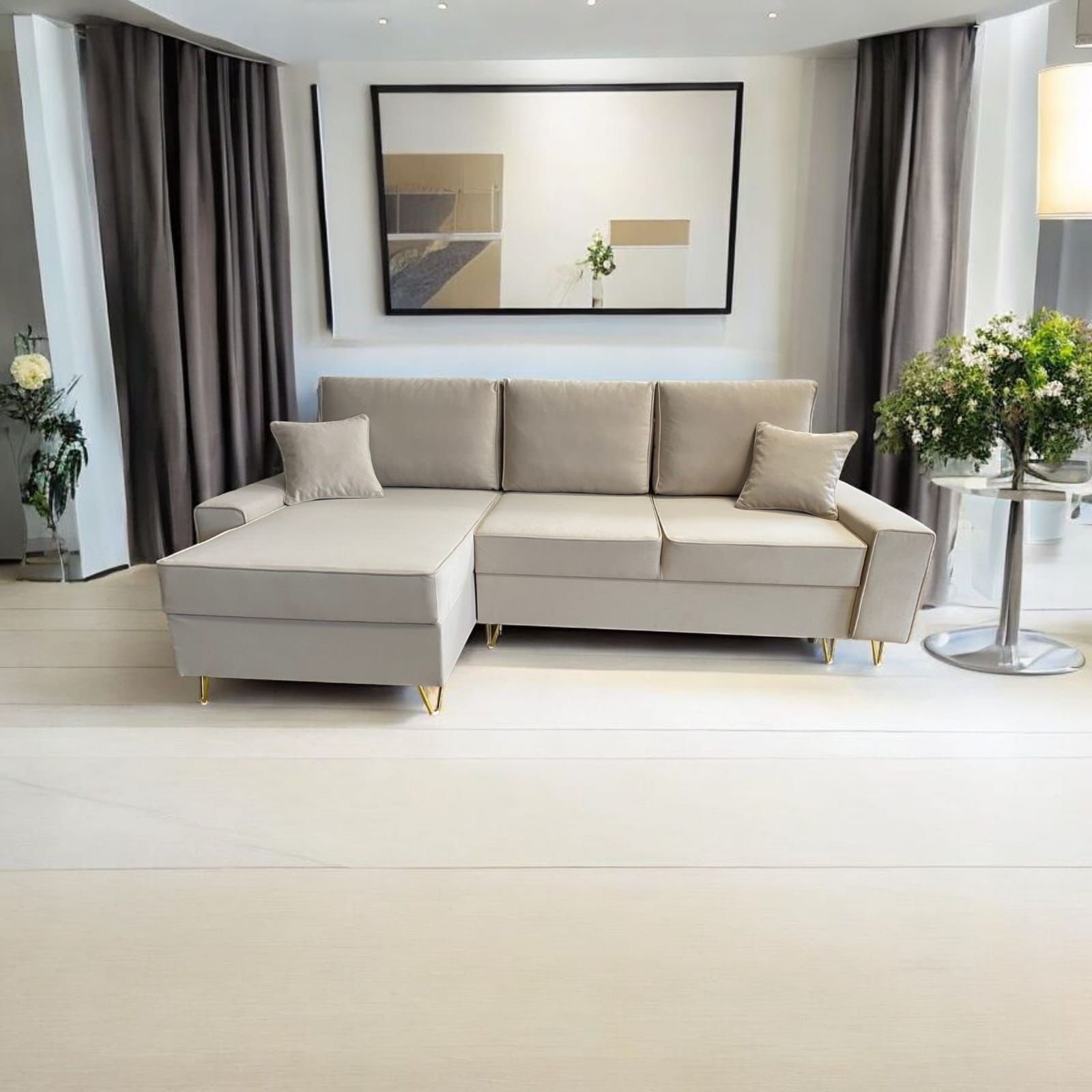 • Design: Prosta, geometryczna forma z eleganckim przeszyciem i złotymi nóżkami nadaje narożnikowi nowoczesnego i luksusowego charakteru.