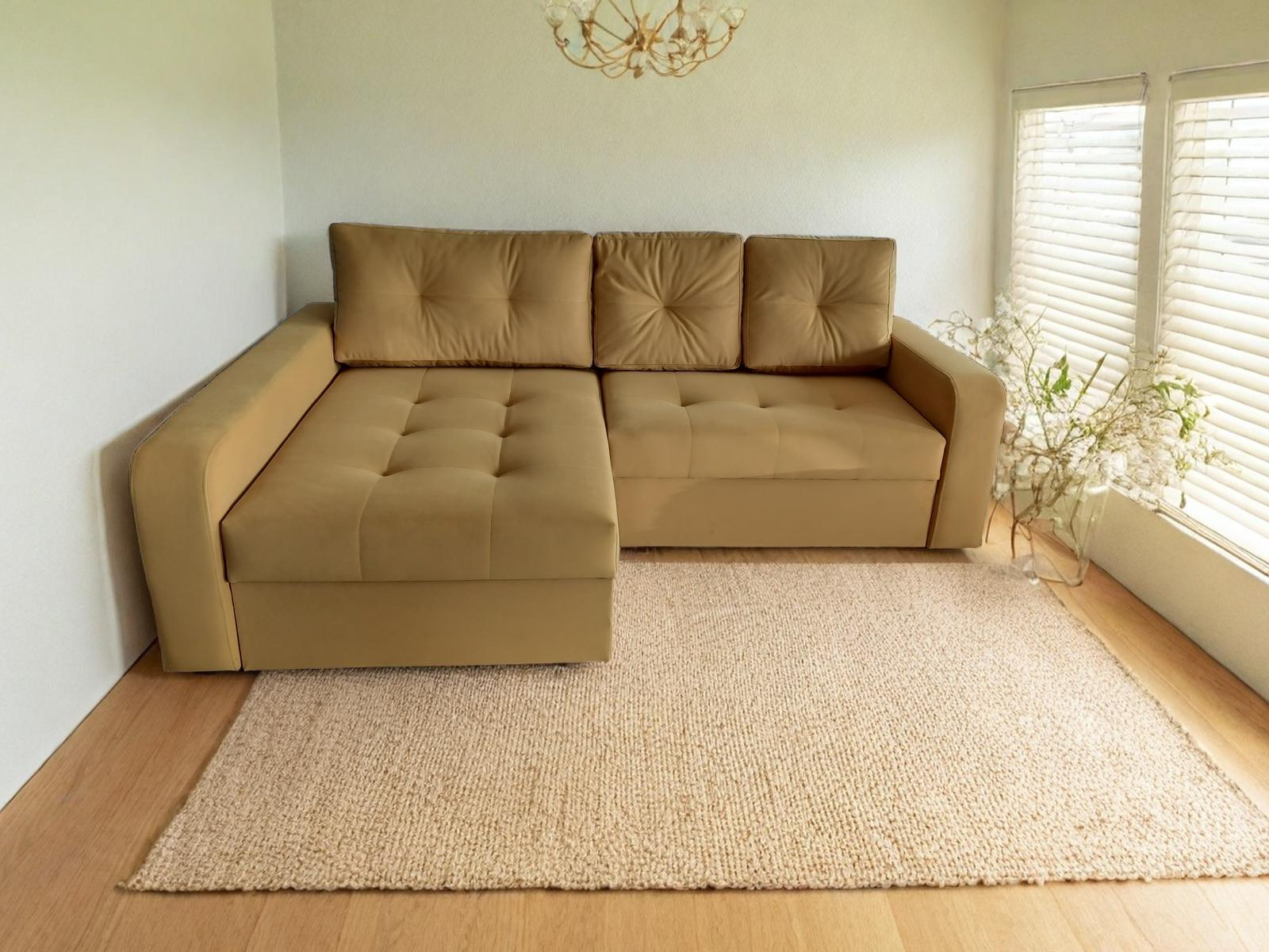 Nowoczesny narożnik Alicante– styl i wygoda w Twoim wnętrzu.  Wprowadź do swojego salonu elegancję i komfort dzięki naszemu nowoczesnemu narożnikowi. Ten wyjątkowy mebel został stworzony z myślą o miłośnikach eleganckiego designu i praktycznych rozwiązań oraz dużej powierzchni wypoczynkowej. Nasza propozycja wyróżnia się wygodnym siedziskiem, które zapewnia najwyższy komfort wypoczynku, oraz miękkimi poduszkami, idealnymi do relaksu po długim dniu. Mebel posiada funkcję spania oraz pojemnik, dzięki któremu zyskasz dodatkowe miejsce do przechowywania. Dzięki bogatej palecie tkanin i kolorów, możesz dopasować narożnik do swojego wnętrza i osobistego gustu. Wybierz spośród różnych odcieni i faktur, tworząc aranżację idealnie komponującą się z Twoim stylem. Wysokie nóżki dodają lekkości konstrukcji, a także ułatwiają utrzymanie porządku pod meblem. Wygląd narożnika po rozłożeniu zależny jest od modelu oraz wymiaru mebla. Cechy produktu: